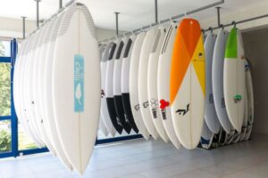 Papan selancar adalah komponen utama dan investasi terbesar. Untuk pemula, disarankan menggunakan softboard (papan dengan lapisan busa lembut) karena lebih stabil dan aman saat terjatuh.
